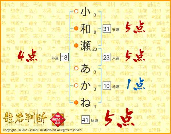 小(3画)和(8画)瀬(20画) あ(3画)か(3画)ね(4画)