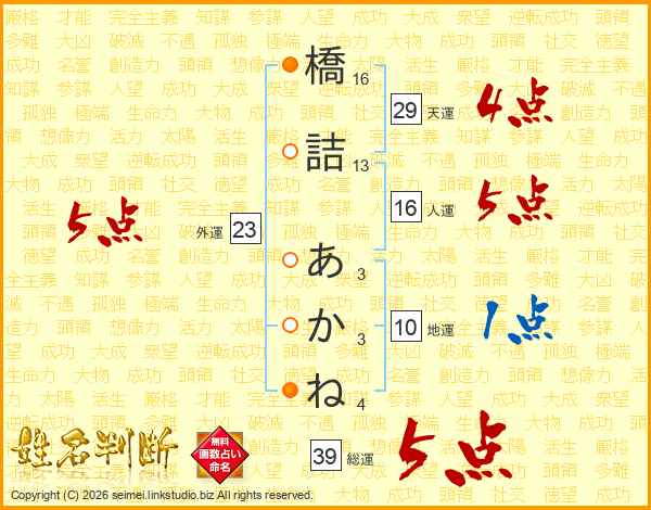 橋詰あかねさんの総運は39画の5点!