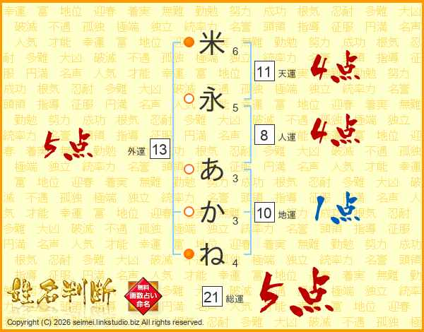 米(6画)永(5画) あ(3画)か(3画)ね(4画)