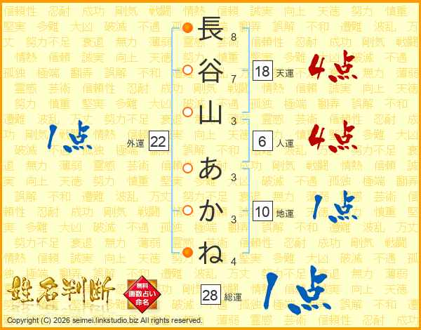 長(8画)谷(7画)山(3画) あ(3画)か(3画)ね(4画)