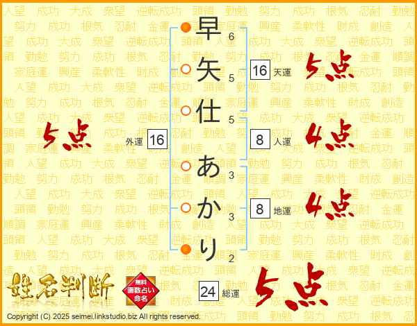 早(6画)矢(5画)仕(5画) あ(3画)か(3画)り(2画)