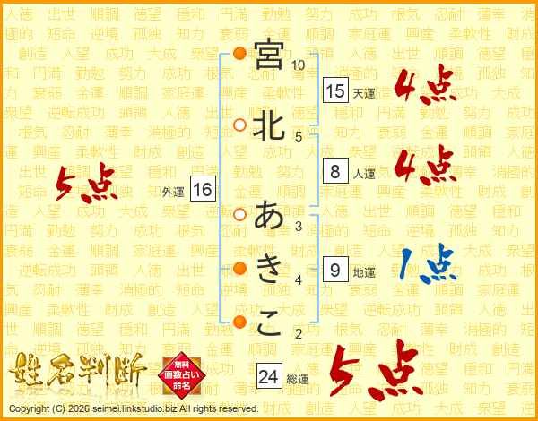 宮(10画)北(5画) あ(3画)き(4画)こ(2画)