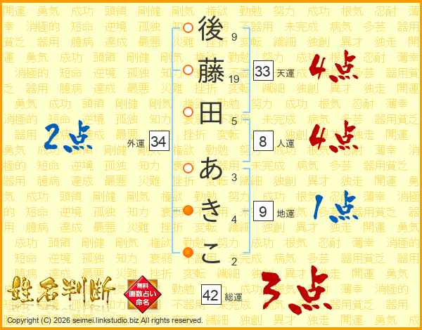 後藤田あきこさんの天運は33画の4点!