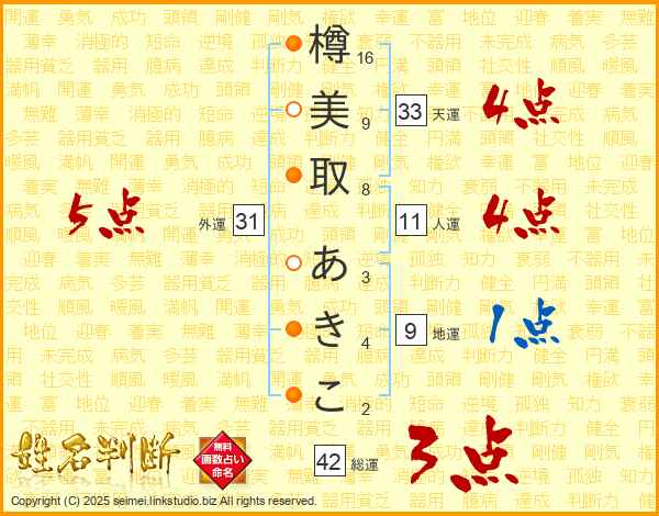生活面を象徴する運勢です。外部から受ける影響力を表し、結婚運、家庭運や職場、環境への順応性を表します。総運から人運を引いた画数。姓や名が1文字の場合を除く。