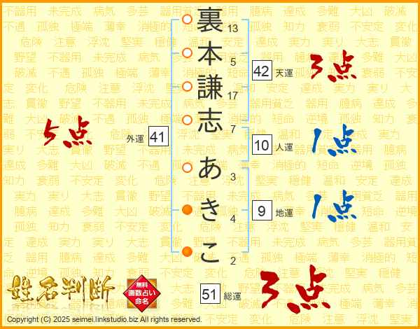 裏本謙志あきこさんの総運は51画の3点!