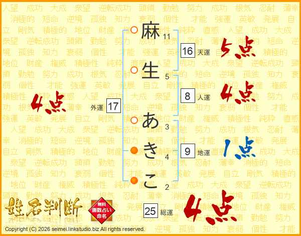麻(11画)生(5画)  あ(3画)き(4画)こ(2画)