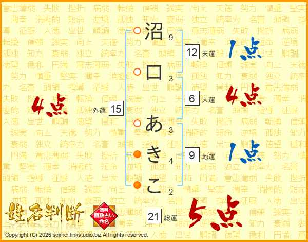 沼口あきこさんの総運は21画の5点!