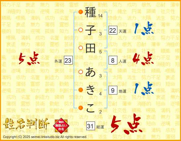 種子田あきこさんの総運は31画の5点!