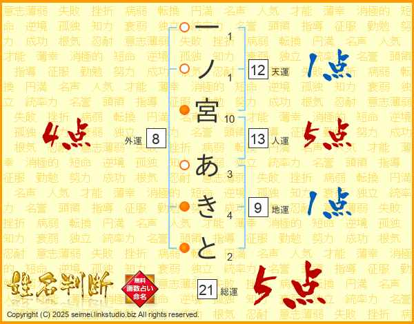 生活面を象徴する運勢です。外部から受ける影響力を表し、結婚運、家庭運や職場、環境への順応性を表します。総運から人運を引いた画数。姓や名が1文字の場合を除く。