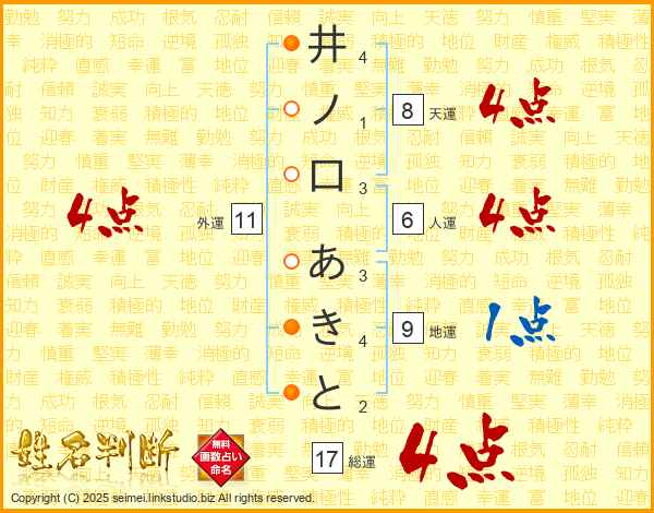 生活面を象徴する運勢です。外部から受ける影響力を表し、結婚運、家庭運や職場、環境への順応性を表します。総運から人運を引いた画数。姓や名が1文字の場合を除く。