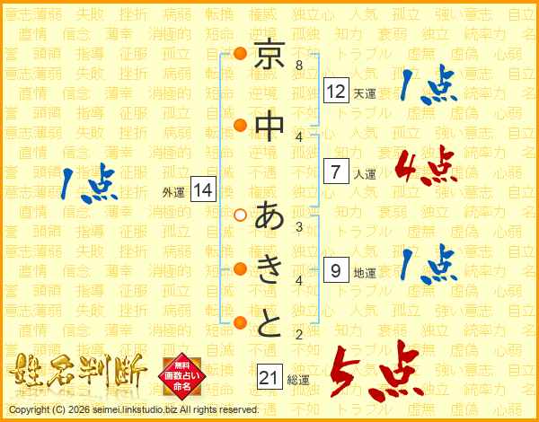京中あきとさんの総運は21画の5点!