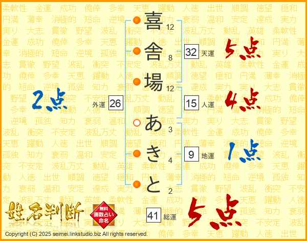 喜(12画)舎(8画)場(12画) あ(3画)き(4画)と(2画)