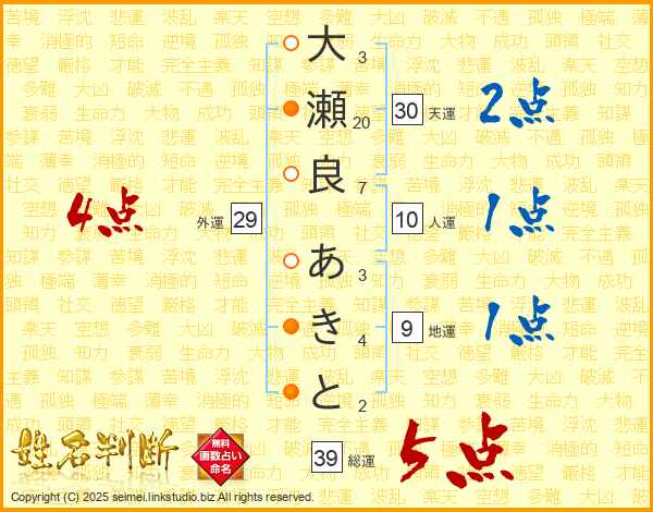 大(3画)瀬(20画)良(7画) あ(3画)き(4画)と(2画)