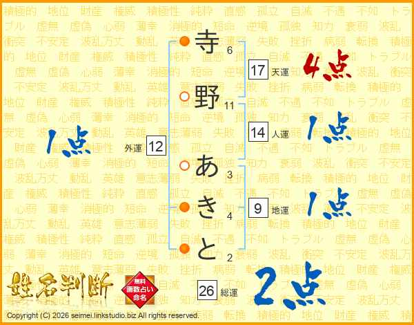 寺野あきとさんの総運は26画の2点!