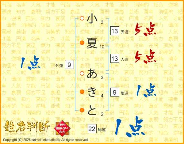 小夏あきとさんの天運は13画の5点!