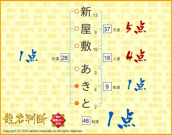 新(13画)屋(9画)敷(15画) あ(3画)き(4画)と(2画)