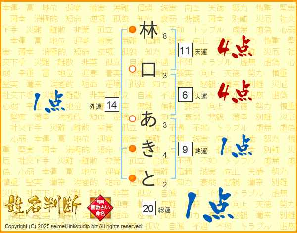 生活面を象徴する運勢です。外部から受ける影響力を表し、結婚運、家庭運や職場、環境への順応性を表します。総運から人運を引いた画数。姓や名が1文字の場合を除く。