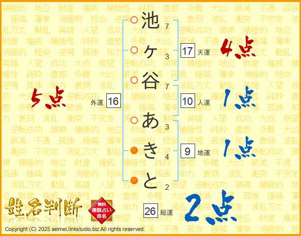池(7画)ヶ(3画)谷(7画) あ(3画)き(4画)と(2画)