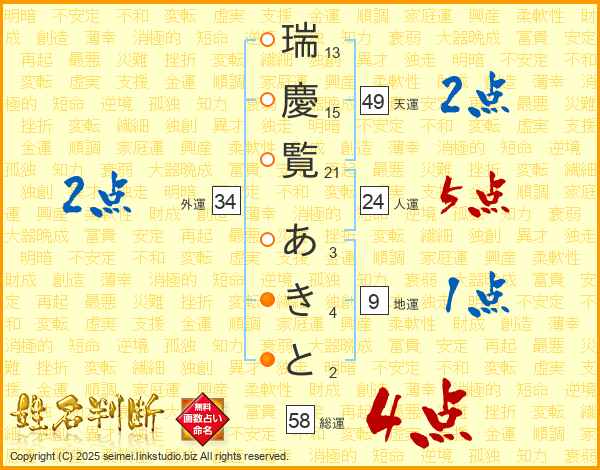 瑞慶覧あきとさんの総運は58画の4点!