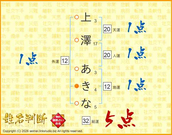 上(3画)澤(17画) あ(3画)き(4画)な(5画)