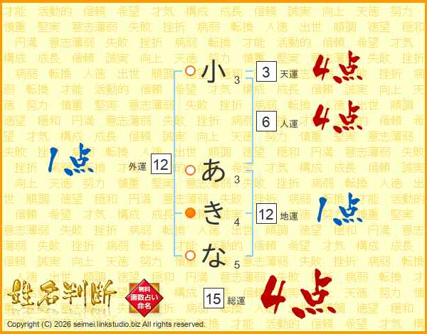 小あきなさんの総運は15画の4点!
