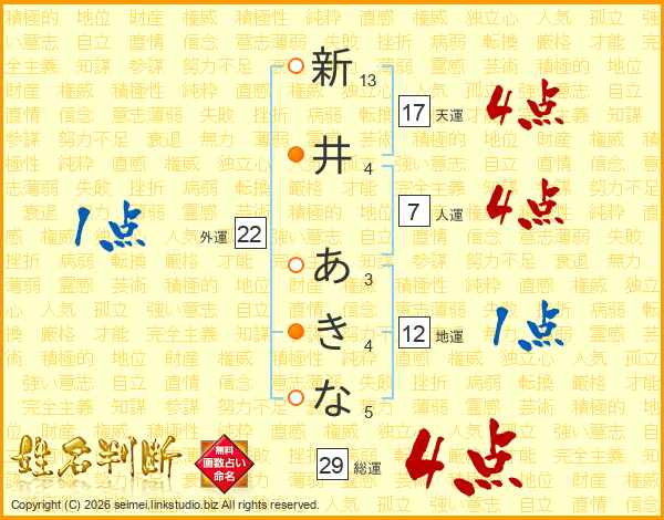 新井あきなさんの人運は7画の4点!
