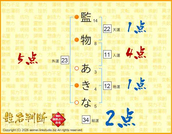 監(14画)物(8画) あ(3画)き(4画)な(5画)