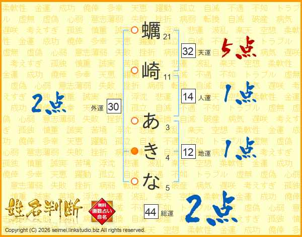 生活面を象徴する運勢です。外部から受ける影響力を表し、結婚運、家庭運や職場、環境への順応性を表します。総運から人運を引いた画数。姓や名が1文字の場合を除く。