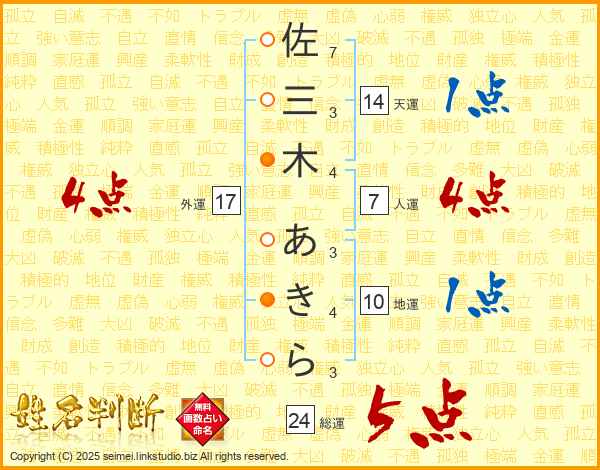 佐(7画)三(3画)木(4画) あ(3画)き(4画)ら(3画)