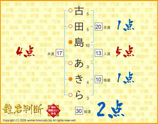 古(5画)田(5画)島(10画) あ(3画)き(4画)ら(3画)