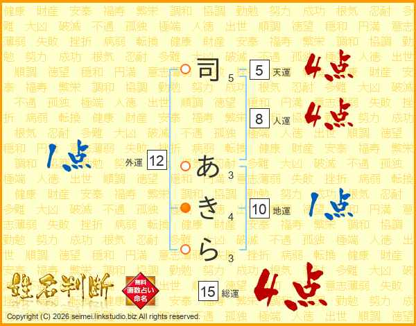 生活面を象徴する運勢です。外部から受ける影響力を表し、結婚運、家庭運や職場、環境への順応性を表します。総運から人運を引いた画数。姓や名が1文字の場合を除く。