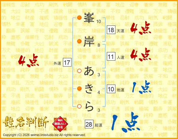 峯岸あきらさんの天運は18画の4点!