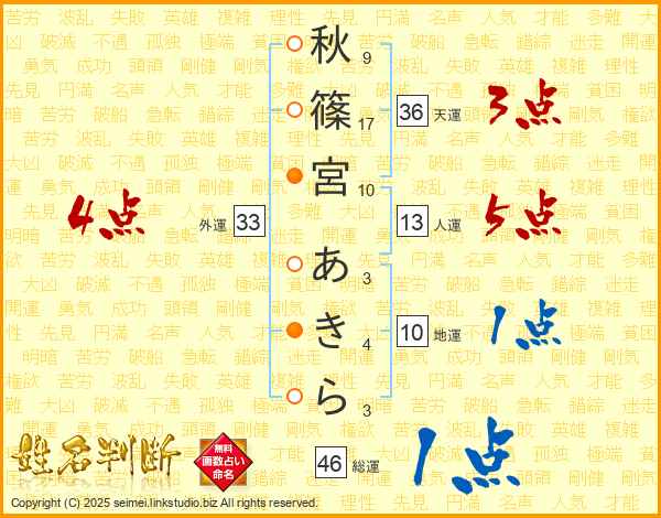 秋(9画)篠(17画)宮(10画) あ(3画)き(4画)ら(3画)
