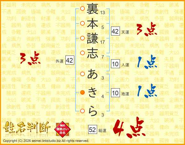 裏本謙志あきらさんの総運は52画の4点!