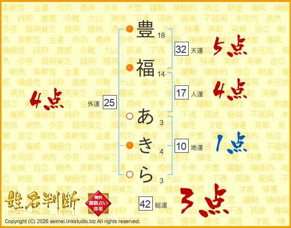豊(18画)福(14画) あ(3画)き(4画)ら(3画)