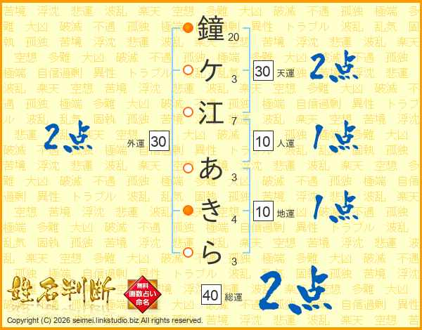 鐘ケ江あきらさんの総運は40画の2点!