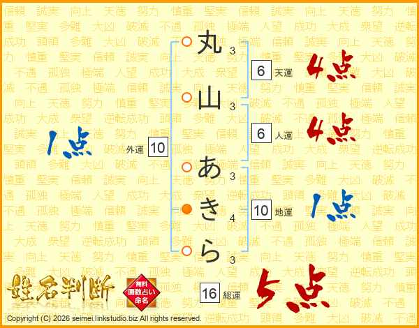 丸(3画)山(3画) あ(3画)き(4画)ら(3画)