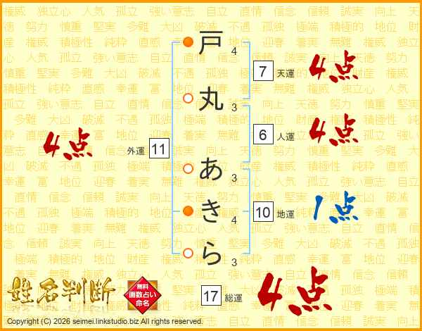 戸(4画)丸(3画) あ(3画)き(4画)ら(3画)
