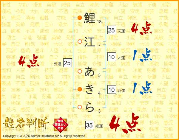 鯉(18画)江(7画) あ(3画)き(4画)ら(3画)