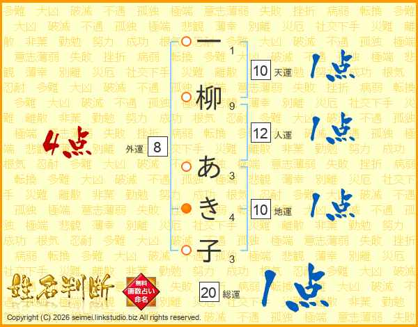 一(1画)柳(9画) あ(3画)き(4画)子(3画)