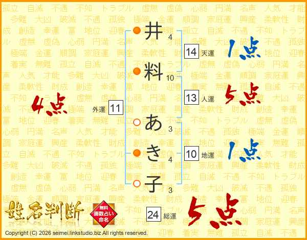 井(4画)料(10画) あ(3画)き(4画)子(3画)