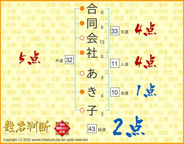 合同会社あき子さんの総運は43画の2点!