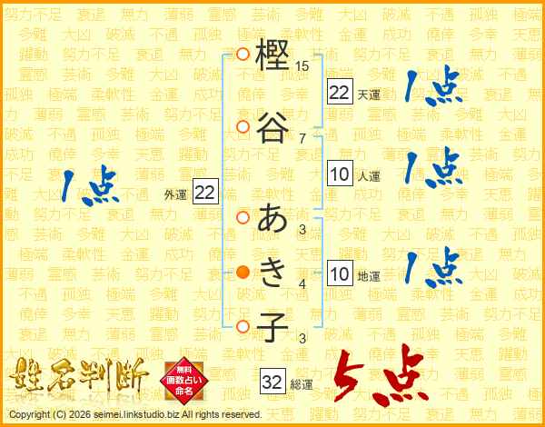 樫谷あき子さんの総運は32画の5点!