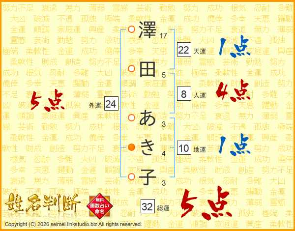 澤田あき子さんの総運は32画の5点!
