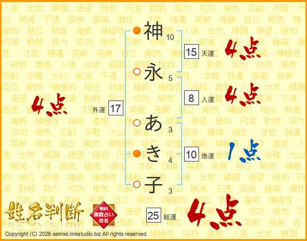 神(10画)永(5画) あ(3画)き(4画)子(3画)