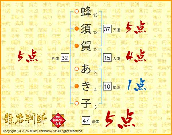 蜂(13画)須(12画)賀(12画) あ(3画)き(4画)子(3画)