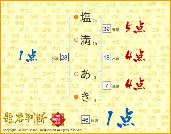 生活面を象徴する運勢です。外部から受ける影響力を表し、結婚運、家庭運や職場、環境への順応性を表します。総運から人運を引いた画数。姓や名が1文字の場合を除く。