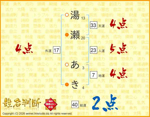 湯瀬あきさんの天運は33画の4点!