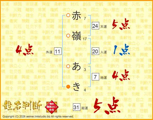 赤(7画)嶺(17画) あ(3画)き(4画)