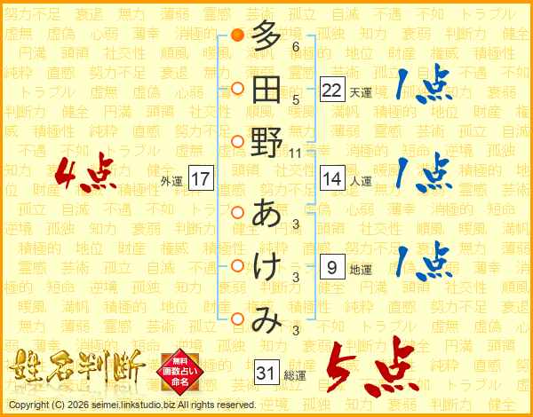 多田野あけみさんの総運は31画の5点!